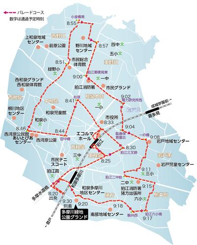 ※多摩川緑地公園グランドを出発し、市内全域を消防団ポンプ車両がパレードします。