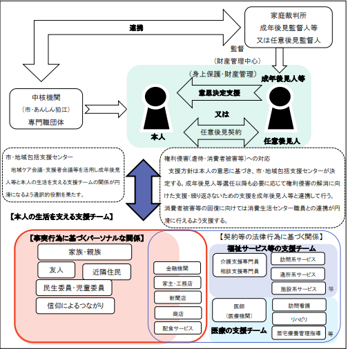 「権利擁護支援の必要な人の発見・支援」、「早期の段階からの相談・対応体制の整備」、「意思決定支援・身上保護を重視した成年後見制度の運用に資する支援体制の構築」という3つの役割を念頭に、既存の保健・医療・福祉の連携(医療・福祉につながる仕組み)に司法も含めた連携の仕組みを構築するものとされ、「チーム」「協議会」「中核機関」を構成要素とします。