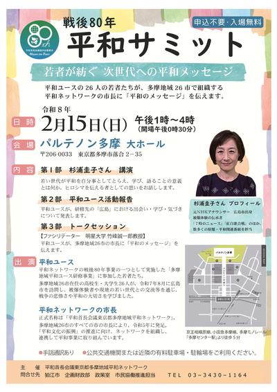 多摩地域26市に在住の高校生・大学生26人の若者たち「平和ユース」が、26市で組織する平和ネットワークの市長に平和のメッセージを伝える「平和サミット」を開催します。