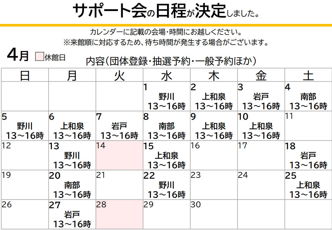 Ⅳ 今後のサポート.pdf [331KB](P102~103)【令和8年3月利用分まで】地域センターは、施設予約システムでの予約・抽選はできません。空き状況のみの表示となります。利用にあたっては、各地域センターで直接利用団体登録・予約をしてください。なお、システム上の表示と実際の空き状況には誤差が生じることがありますので、詳細は直接各地域センター窓口までお問い合わせください。