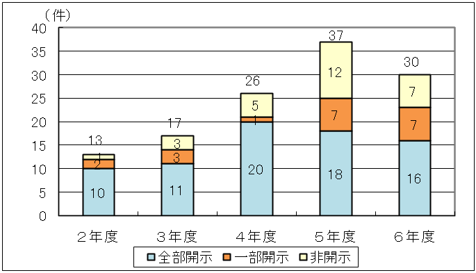 令和6年度は、30件の保有個人情報の開示請求がありました。これらに対し、全部を開示したものが16件、一部を開示したものが7件、非開示にしたものが7件でした。個人情報の訂正及び利用停止の請求は0件でした。