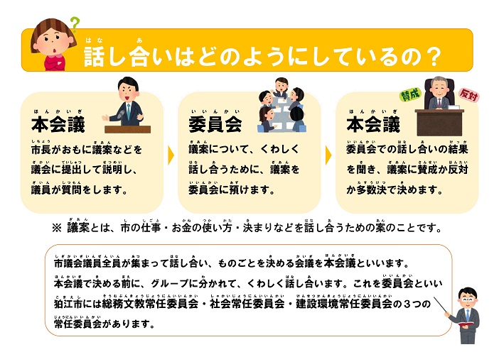 狛江市議会のことをもっと知ってもらうためのページです。市議会は、狛江市をよりよくするために大切な役割をしています。 このページを見て、市議会についていっしょに学び、考えましょう!
